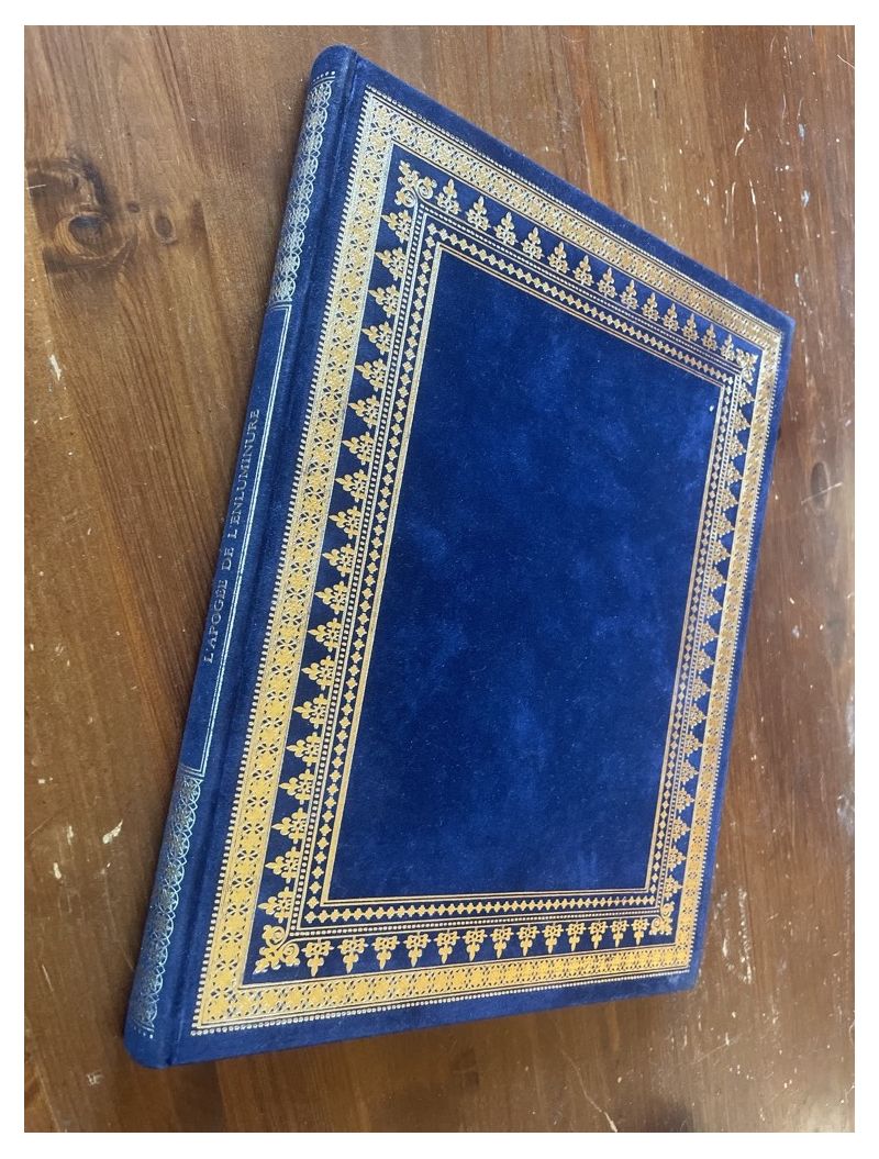 | Aspect | Pleine reliure de velours bleu décoré de motifs dorés sur les plats et le dos, très bon état |